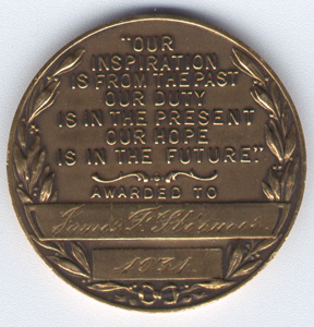 Believed to be an early example of the Sons of the American Revolution's Good Citizenship Medal, this bronze award was presented to James P. Stormer in 1931. The maker's mark is on the edge. Gift to the TXSSAR Archives, March 2004.