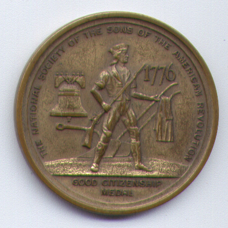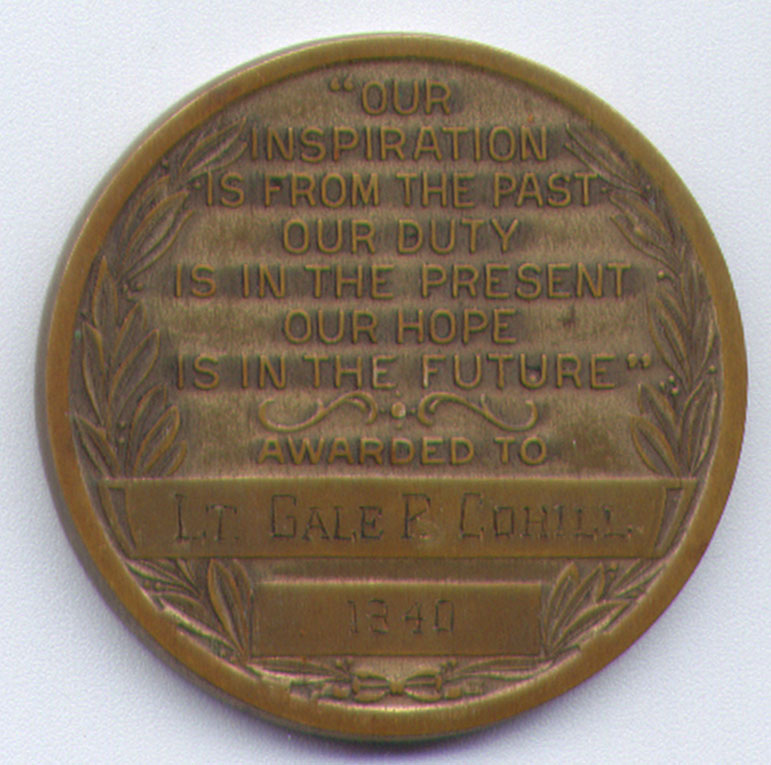 This example of the Good Citizenship Award was presented in 1940 to Lt. Gale B. Cohill. The front of the circular bronze medallion depicts the Minuteman flanked by the Liberty Bell and the date 1776. Around him is inscribed "The National Society of the Sons of the American Revolution". Below is the phrase "Good Citizenship Medal." The reverse of the pendant has a border of laurel, and the inscription "Our Inspiration is from the past, our duty is in the present, our hope is in the future", and has been engraved with Lt. Cohill's name and the date of presentation. The medallion shows a middle initial of "P", which has been changed to a "B" with scratches. Gale B. Cohill (1918-1988) attended Charlotte Hall Military Academy, served with the U.S. Air Force from 1942 to 1945, and was a member of the House of Delegates, Washington County, Maryland. This example of a Good Citizenship Medallion is deposited with the TXSSAR Archives in honor of Tom Whitelock, and his work on behalf of the TXSSAR Archives in helping to preserve the history and heritage of the Texas Society Sons of the American Revolution.