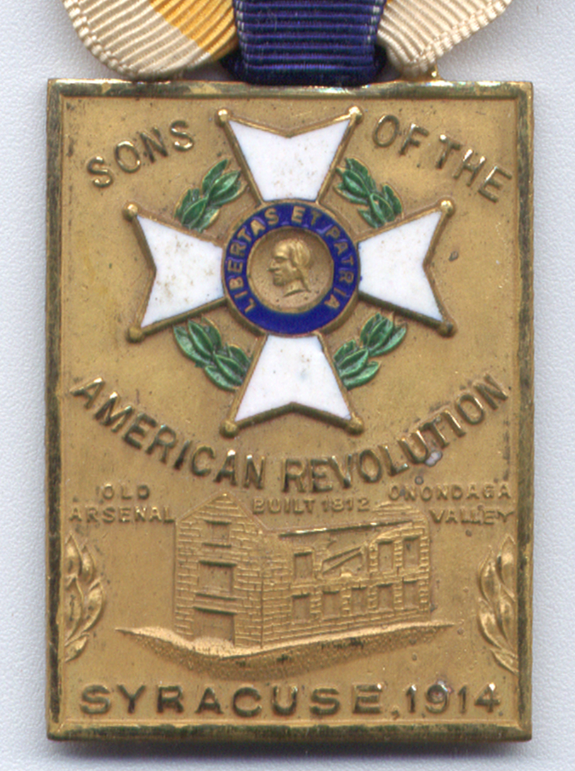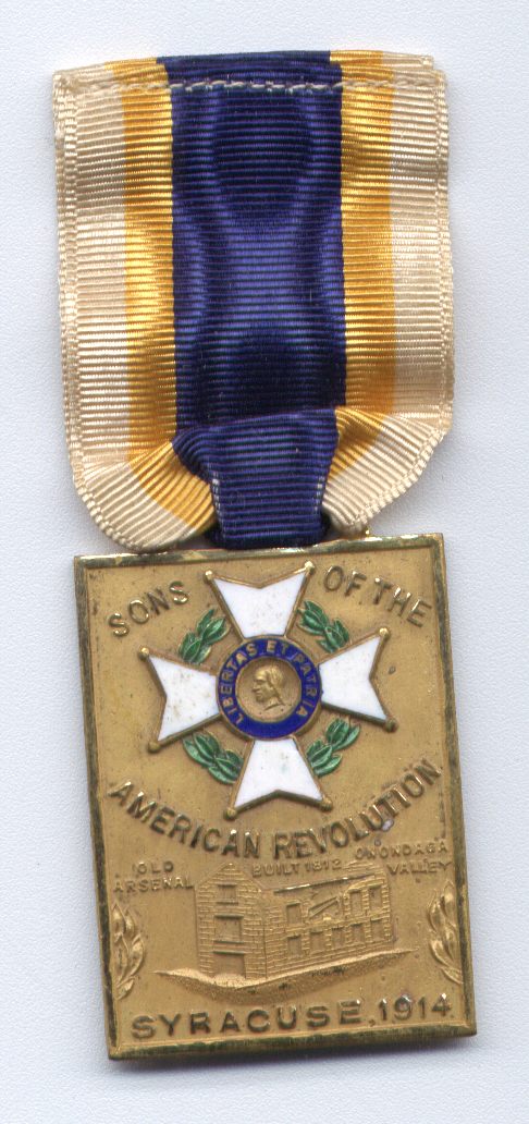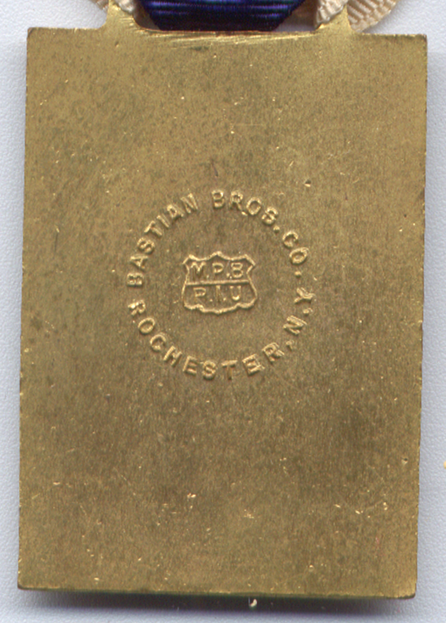 The reverse of the pendant shows the mark of the maker, Bastain Brothers Co., of Rochester, New York. The Medal is suspended from a ribbon of white, blue and yellow - the colors of the society. This example is lacking the pin by which it would have been worn.