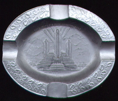 Pewter-colored metal ashtray produced as a commemorative souvenir of the Century of Progress World's Fair, held in Chicago, Illinois from May 17, 1933 to November 12, 1933, and reopened May 16 to October 31, 1934. The center of the ashtray has a representation of The Federal Building, constructed for the fair. On the reverse is the importer's mark.