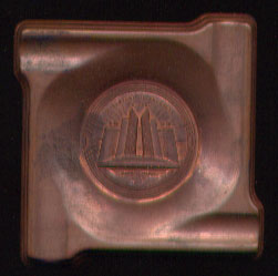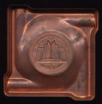 Copper metal ashtray produced as a commemorative souvenir of the Chrysler Motor Exhibit of the Century of Progress World's Fair, held in Chicago, Illinois from May 17, 1933 to November 12, 1933, and reopened May 16 to October 31, 1934. The center of the ashtray has representations of the Chrysler pavilion.