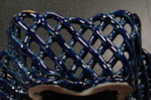 The sides of the bowl are an openwork design simulating weaving. The whole is glazed dark blue, with some mottling, and the rim is gilt.