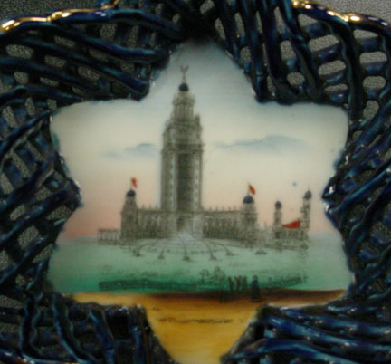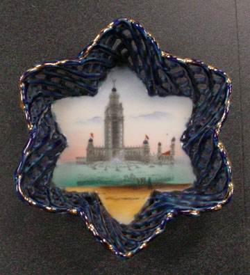 Shaped as a six-pointed star, the blue-glazed bowl features a view of the Electric Tower, one of the most prominent landmarks of the fair.