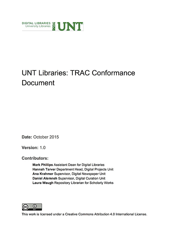 UNT Libraries: TRAC Conformance Document serves as an audit of the activities and methodologies behind the preservation of and access to content in the UNT Libraries’ Digital Collections. The audit examines two major infrastructure pieces: the Coda repository system, used for preservation services, and the Aubrey system, which provides public access to digital resources through The Portal to Texas History, the UNT Digital Library, and the Gateway to Oklahoma History.