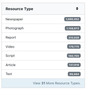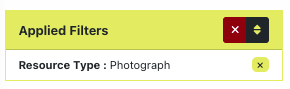 Filters. A filter will only display if at least two options are available, depending on permissions and other criteria. For example, if an editor only has access to photograph collections, they will not see the “resource type” filter; if the search term (or other set filters) only apply to public records, the “visibility” filter will not display. Here is a full list of possible filters: