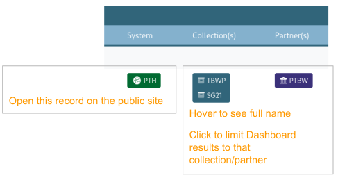 Searching. Entering terms in the search box will look for matching text in any records displaying in the Dashboard (i.e., based on filters and editor permissions). The search can be general, limited to a specific field, or in the item text (using the OCR for printed text items).