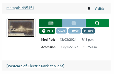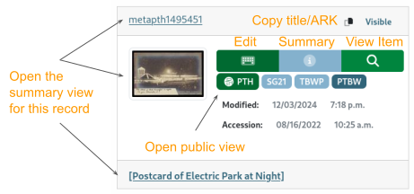 The record summary displays a large view of the item thumbnail along with a summary of information about the record: