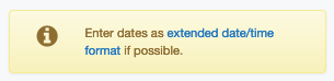 This warning appears if a value in the date or coverage date field does not conform to EDTF specifications (check guidelines for more info) |