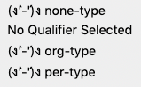 Note that creator and contributor have two options: the role (main qualifier) and the type, listed at the bottom of the list as per-type (personal name) and org-type (organizational name)