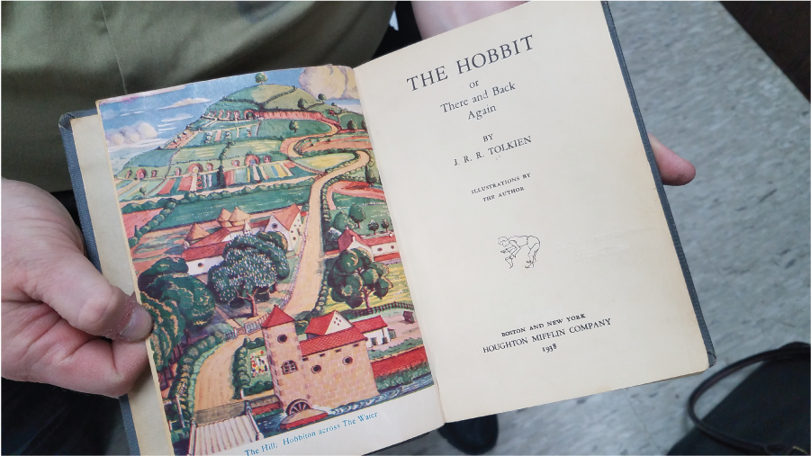 The returned book is currently being cataloged and assessed by preservation, but we plan to have the book available in the Special Collections Reading Room for those curious to see the illustrations in person or to read the original chapter with Gollum.