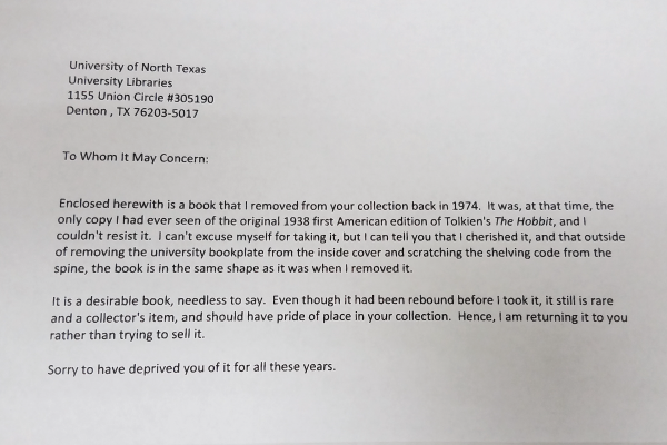 Last week, UNT Libraries received a special delivery, an anonymous letter and a first American edition of the J.R.R. Tolkien classic, The Hobbit. The letter stated that the sender had taken this copy of The Hobbit from UNT Libraries in 1974, and has cherished it ever since. This version of The Hobbit contains beautiful illustrations by the author, and the original version of the chapter concerning Gollum and the Ring, which was later revised as Tolkien wrote the Lord of the Rings trilogy.