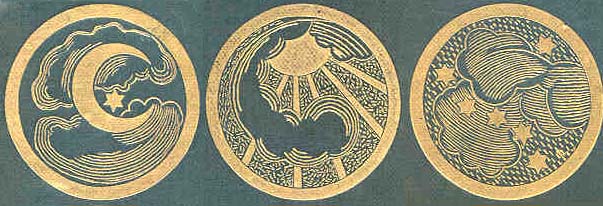 Below: Close-up of the three circular designs, featuring the moon, sun, and stars. |