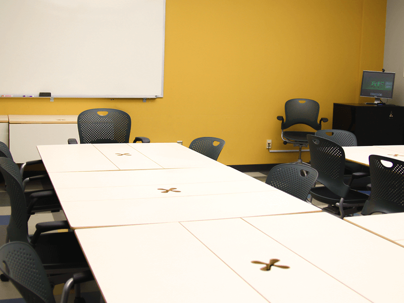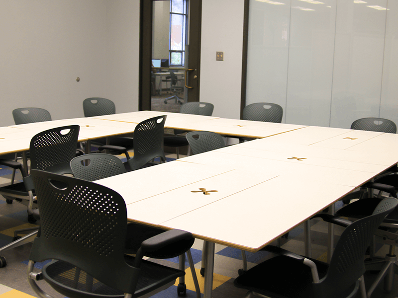 Located on the main floor of the Sycamore Library, Sycamore Hall, 110A is a small study room used for presentations and group study. Students and library employees can reserve this room.
