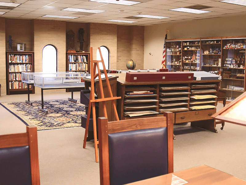 The Reading Room regularly hosts exhibits of the Special Collections and it is the primary space used to do research with physical items from the collections that are rare or fragile.